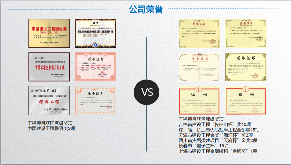经过多年发展,公司已成为吉林省工程监理、招标代理行业龙头企业,连续多年被评为吉林省先进监理企业。2008年被中国建设监理协会评为“中国建设监理创新发展二十年工程监理先进企业”,2012年被评为“中国工程监理行业先进监理企业”;连续六年被评为“全国招标代理机构诚信先进单位”,吉林省工程建设项目招标代理机构信用等级评价A级。公司董事长张明为吉林省建设监理协会会长。