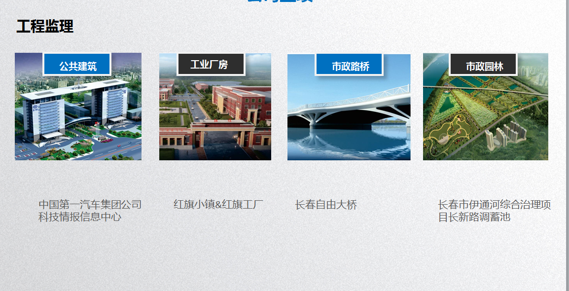 公司自成立以来承揽了大型工业厂房、公共建筑、配套住宅小区及景观、古建筑、园林绿化、市政工程、公路及桥梁等项目。承接了工程的勘察、设计、施工、监理以及与工程建设有关的重要设备、材料采购招标的代理业务。所监理的项目获鲁班奖1项,“哈沈大长”四市优质观摩工程金、银奖30余项。