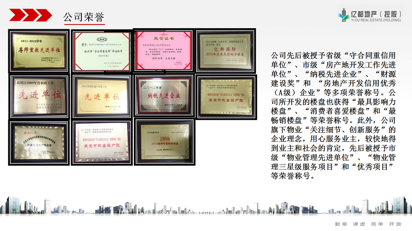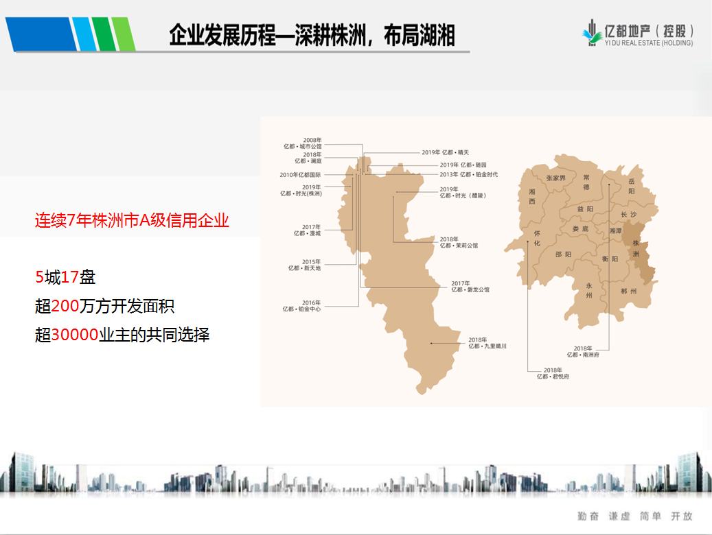 株洲市亿都房地产开发有限责任公司成立于1993年,经历了从市政项目到住宅地产、写字楼、商业地产等多元化转变,从单项目到多项目积累了丰富的开发经验,目前在株洲市区有12个大型楼盘,炎陵、醴陵、益阳南县、怀化芷江均有在建楼盘。公司旗下有忆家物业管理有限公司及株洲红旗广场希尔顿欢朋酒店。忆家物业全面服务于亿都地产的开发项目,服务面积超过200万平方米,所管项目多次获得湖南省优荣誉,荣居A级信用物业企业。株洲红旗广场希尔顿欢朋酒店入驻于5A级全玻璃幕墙的高端写字楼-亿都铂金中心,作为希尔顿旗下最大的国际中高端商务连锁酒店品牌,致力于为亲子家庭及高端商旅精英提供舒适优质的入住体验。亿都在推动产业进步,促进城市发展、提升城市价值等方面作出了积极贡献。