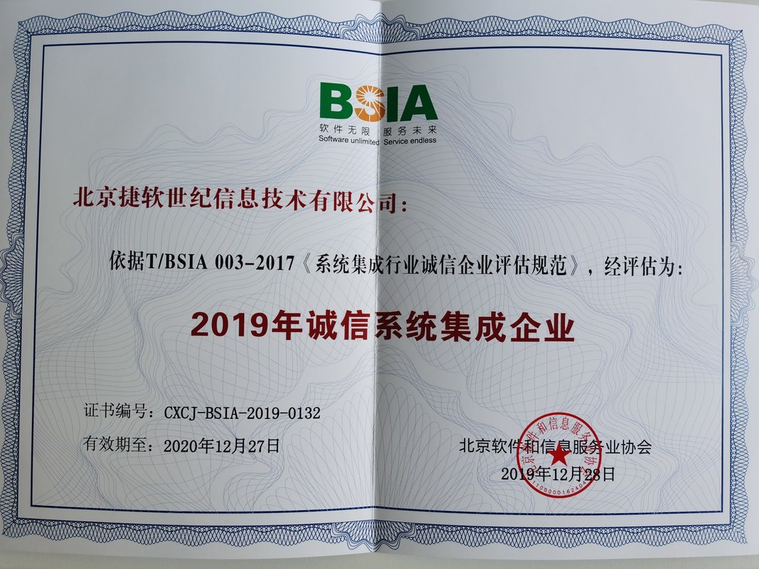 捷软世纪研发工作遵循CMMI、ISO9001管理规范,具有国家高新技术企业、北京市诚信创建企业、北京市诚信系统集成企业、中关村高新技术企业等资质。