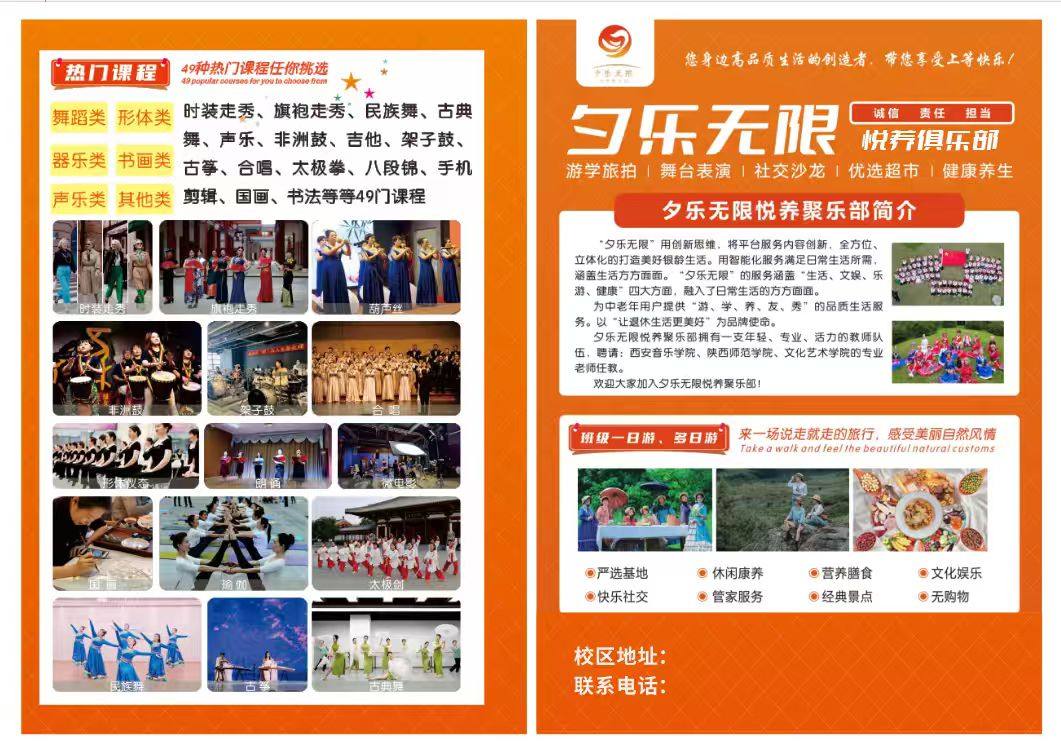 夕乐无限悦养聚乐部,我们的 成立初衷是为了给广大银发人群提供一个温馨、 快乐、 充满活 力的平台 ,让他们在这里能够享受到丰富多彩的精神文化生活 和专业的健康服务。 我们致力于打造一个集文化交流、 艺术培 训、旅游休闲健康管理等多 种活动于一体的综合性聚乐部。 通 过组织各类活动 ,满足银发人群不同的兴趣爱好和需求 ,让大 家在银龄生活中感受到关爱和尊重。 我们相信 , 每个人都有权利拥有幸福、 健康、 充实的生活。 夕 乐无限 银发聚乐部将不断努力 , 为广大银发人群创造更多的快乐 和美好回忆!